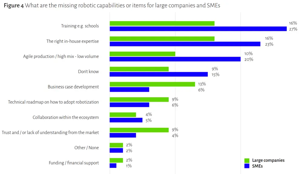 Het gebrek aan de juiste training en opleiding is zowel voor grote bedrijven als voor kmo's de voornaamste reden om geen robots in te schakelen