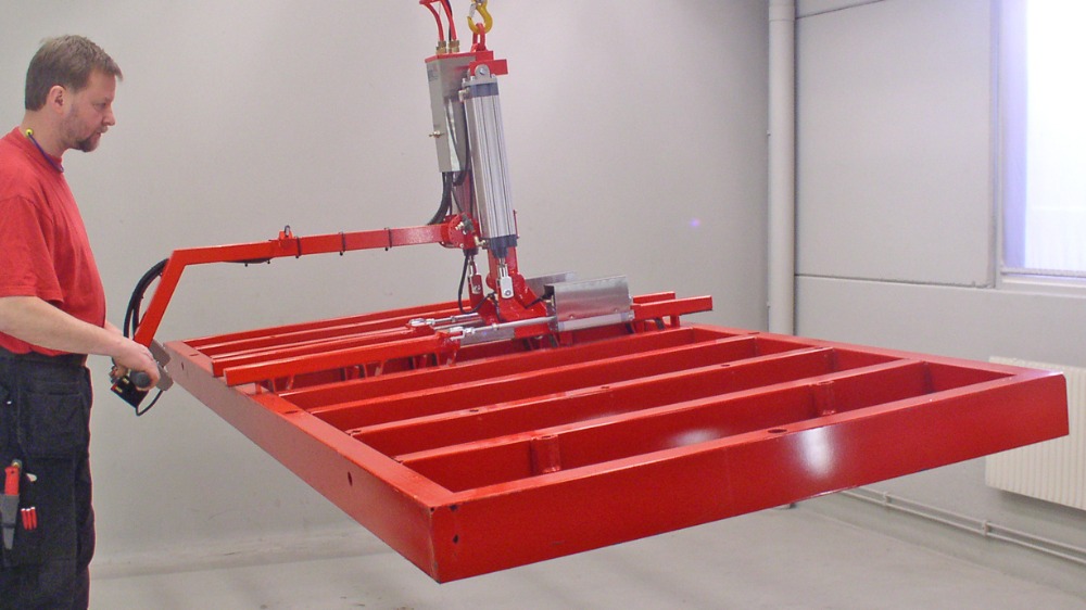 Des pièces lourdes transportées dans les airs est une application qui exige une approche méticuleuse en terme de sécurité. Pour cela, les fabricants travaillent dans plusieurs domaines. P.ex., le vide requis pour les pinces est calculé selon un facteur double. La force pour soulever votre pièce est doublée. S'il y a aussi un mouvement de bascule – tel que l'inclinaison des panneaux – on applique même un facteur 4.