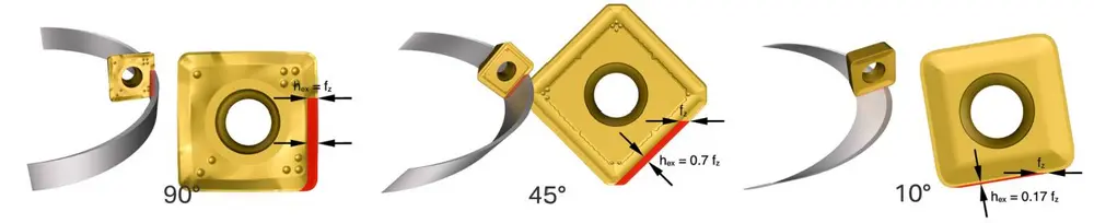 Outre les paramètres évidents, vous ne pouvez mésestimer l'impact de l'angle de réglage ceci veut dire l'angle entre l'arête avant principale et la surface de la pièce sur la productivité du processus de fraisage. L'angle de réglage ou angle d'attaque influence à la fois les forces de coupe et la tenue de l'outil. Ceci peut faire une grande différence. Dans de nombreux toolshops, on choisit assez vite une plaquette ayant un angle de réglage de 90 tout simplement en raison de la disponibilité. Comme les forces de coupe sont essentiellement orientées de façon axiale, ceci est un outil idéal pour fraiser des rainures carrées, mais moins pour le fraisage à surfacer. Avec un angle de réglage de 90°, l'alimentation par dent (fz) est en effet égale à l'épaisseur de copeau (hex). En d'autres termes, il se produit un effet d'amincissement, tandis qu'un copeau mince génère de grandes sollicitations. Pour cette raison, les fabricants conseillent plutôt un angle de 45° pour le fraisage à surfacer, les forces axiales et radiales étant bien équilibrées. Un angle de réglage de 10° est aussi une possibilité et s'accompagne de copeaux très minces, jusqu'à six fois plus minces qu'avec 45°!